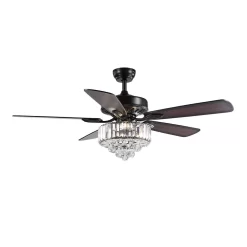 This 5 blade black crystal ceiling fan with remote control is a perfect addition to any living room. Featuring a black finish and clear crystal accents, this fan brings style to any space. The remote control allows you to adjust and customize your comfort from anywhere in the room.