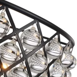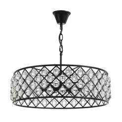 Add a classy yet brilliant touch to your living space with the bold and dramatic composition of this Black Drum Shaped Crystal Pendant Light. This contemporary fixture uses a drum-shaped silhouette punctuated with rows of crystal clear glass orbs that wonderfully reflect and refract illumination from the interior light source. A single, sturdy chain suspends the lamping from its base for a clean yet statement worthy display. Hang this piece over a cozy dining table or kitchen nook. Will also look fantastic as a lighting centerpiece in the bedroom, foyer or patio.
