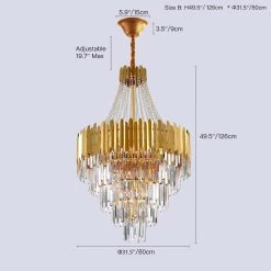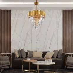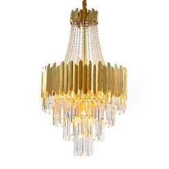 This modern luxury crystal chandelier features a golden finish, adding a sophisticated touch to any entryway or foyer. Perfectly crafted with expertly cut crystals, this chandelier will illuminate your home with brilliance and style.