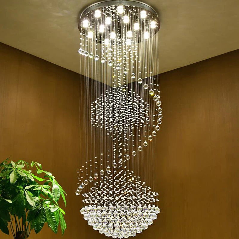 Make an opulent statement in towering spaces of your home with the lavish crystals and glowing light of this Large Ball Shape Raindrop Crystal Chandelier. The piece is highlighted with a dramatic cascade of glittering crystals, tapering illumination from its base down through each strand. A geometric element is infused into the design, with dangling spheres and beads in varying lengths held securely by a stainless steel ceiling plate. The crystal pieces interact with the light to create unique shapes that ultimately contribute to an overall look that will surely transform your living room, foyer, entryway, or staircase.