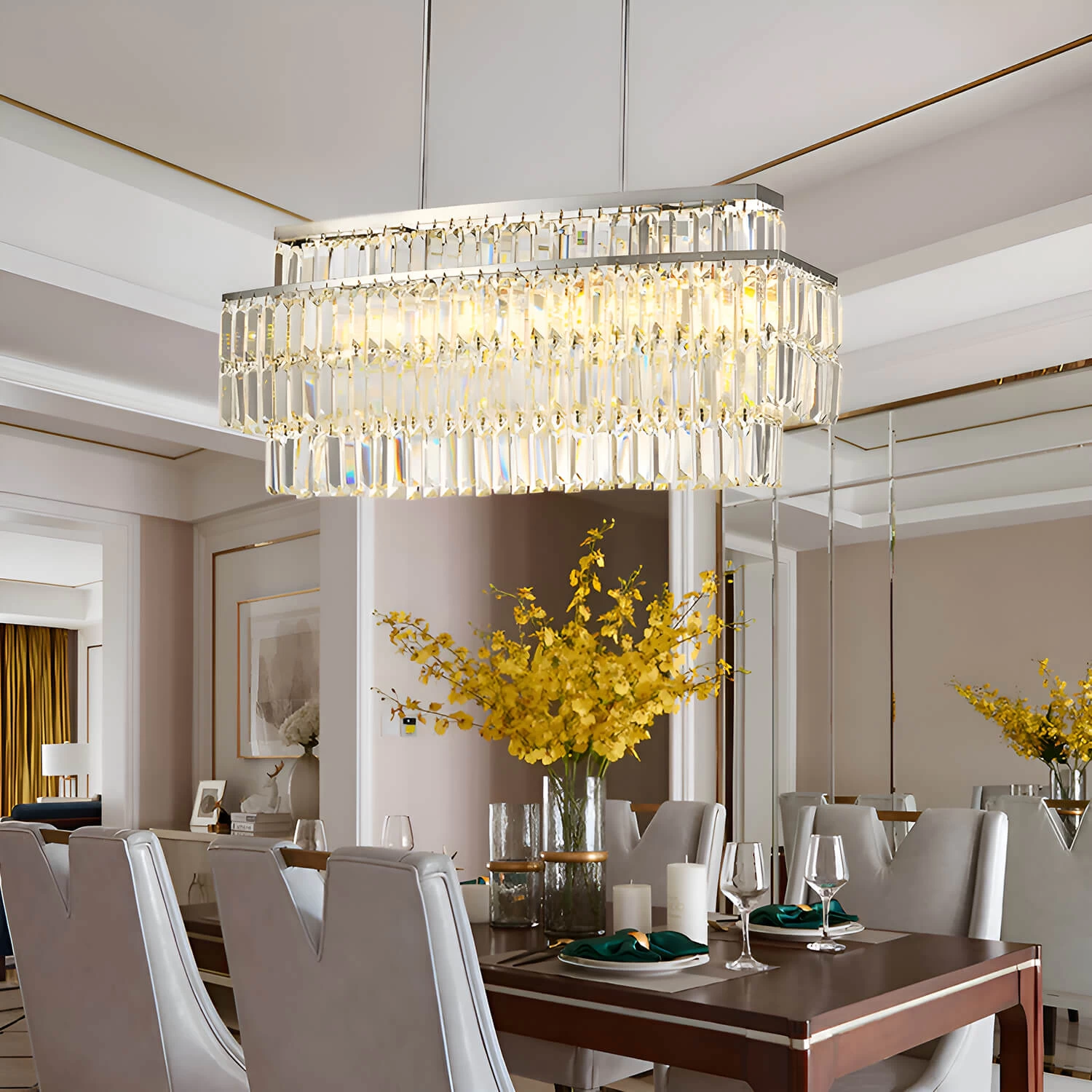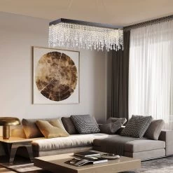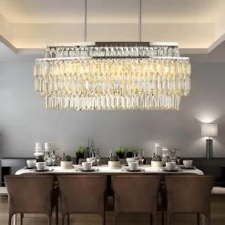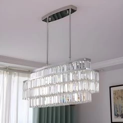 This sophisticated chandelier features a modern rectangular design with a rod-type pendant light. The clean lines and shimmering crystals make this light a stunning addition to any home. Perfect for any space, the contemporary crystal chandelier is sure to add a touch of class.