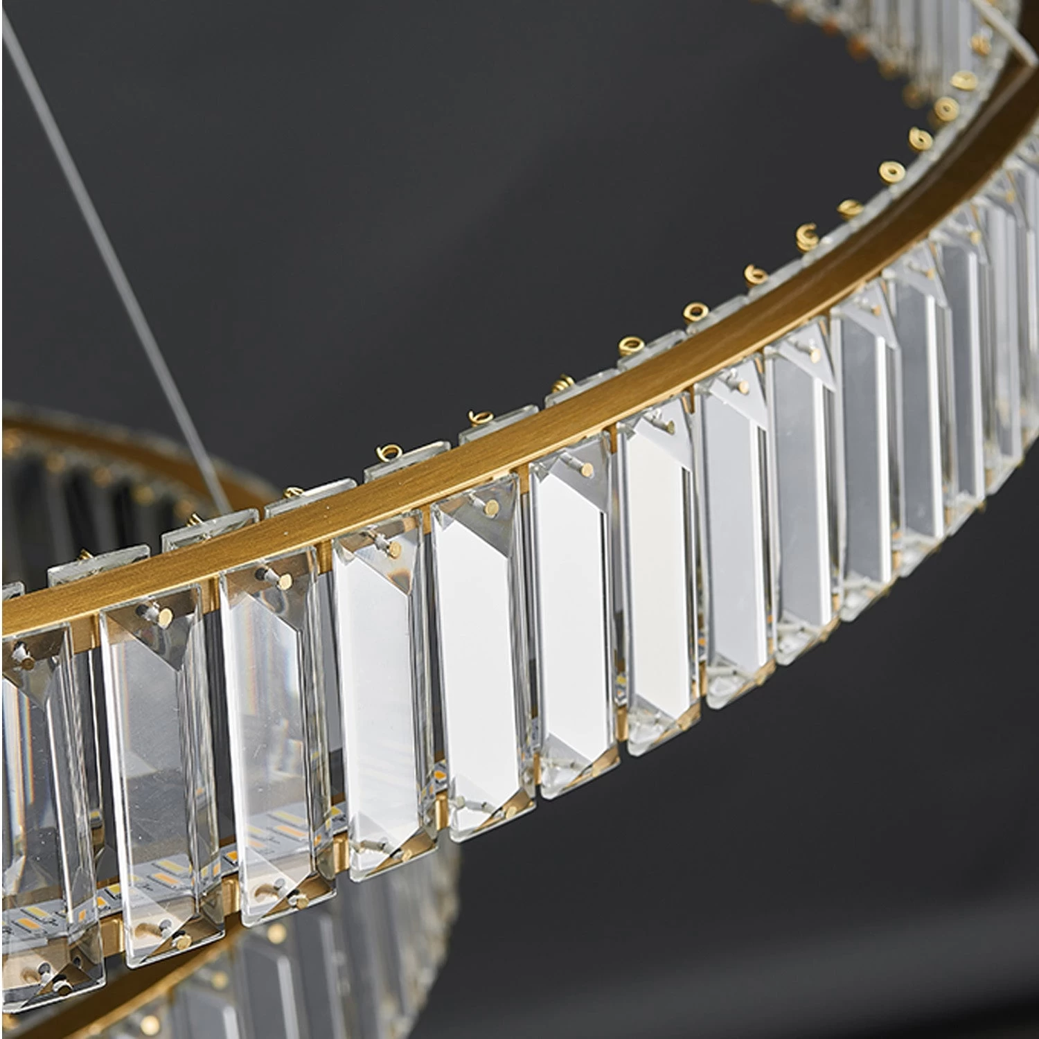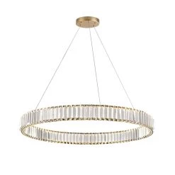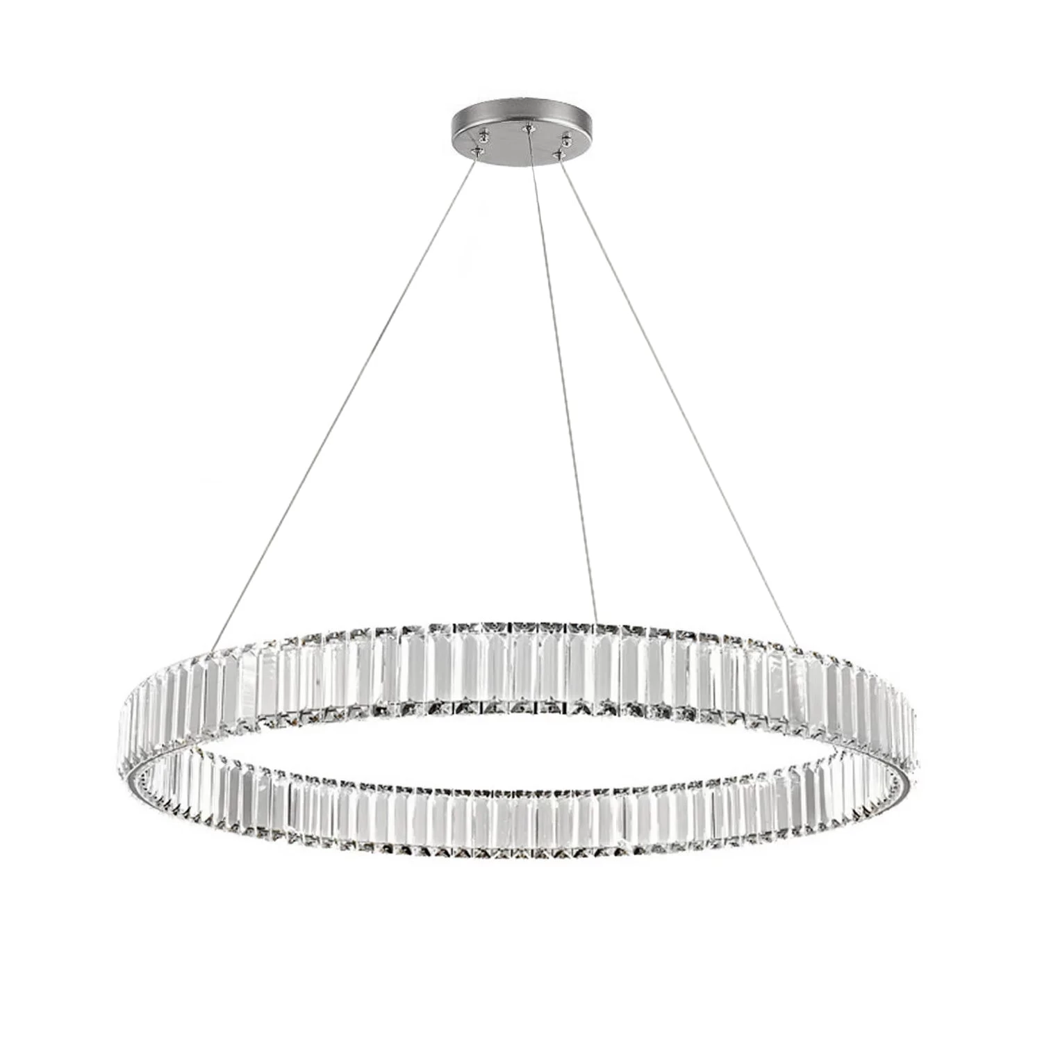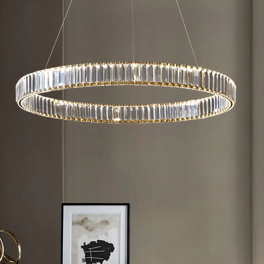 Enliven indoor spaces with this clever contemporary take on the time-honored chandelier. The silhouette is simple and relies on making the materials its centerpiece. Rows of sparkling, faceted crystals are fused together to create a perfectly-formed circle that looks splendid even with the lights off. The pendant light is enlivened by an ultra-slim LED module wrapped across the base that diffuses light through the crystals. This results in a resplendent halo of radiant illumination coming from a very minimalist piece that will dress up any modern living room or dining area in a unique and artistic way.