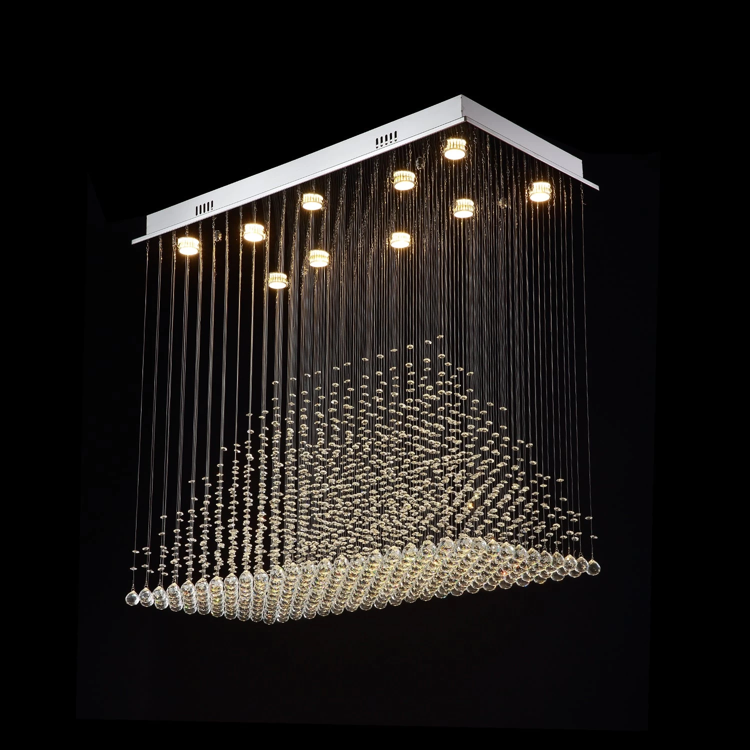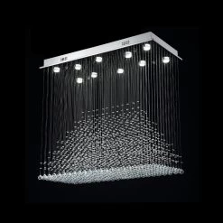 Bask in a rainfall of elegant and sparkling light with the Pyramid Raindrop Crystal Chandelier. This imposing lighting fixture is adorned with an abundance of multi-faceted crystal beads dangling from a sturdy rectangular base. Strands of shimmering beauty create the impression of a tropical shower cascading over your dining table, living area or kitchen island. This show-stopping piece doesn’t really require the lights on to captivate the eye but when illuminated, a delicate, ambient glow emerges and there’s no stopping this chandelier from eliciting all the oohs and aahs.