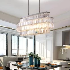Make a bold and glamorous addition to your living space with an eye-catching rectangular crystal chandelier. Suspended by a set of down rods, this linear suspension light fixture comes with a series of sparkling, multi-faceted K9 crystals distributed evenly across a robust metal frame. Light sources nestled within enabling the design elements to come to life when lit, amplifying the brilliant effect of light shining through each crystal. It’s the ideal option to hang over a rectangular dining table or a kitchen island, especially if you prefer downward lighting coming from a single source for a dynamic and awe-inspiring ambiance.