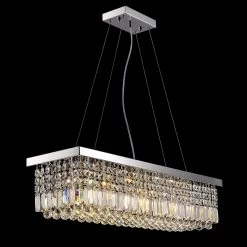This contemporary crystal raindrop chandelier is creatively designed in a rectangular fashion, with hand-picked multi-faceted K9 crystals of various shapes hanging from a sturdy stainless steel frame and base. The sparkling crystals refract light in multiple angles when lit, making this pendant light a great addition to your living space if you’re looking for just the right amount of glitter in ambient lighting. A perfect statement piece, this gorgeous crystal fixture will easily add elegance to your dining room, bedroom or kitchen and transform any other area of your home into a luxurious and charming realm.