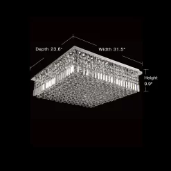 Give your home space a glamorous makeover with this Rectangular Raindrop Crystal Flush Mount Chandelier. Affixed on the ceiling by a sleek chrome panel, a curtain of gleaming, faceted K9 crystals fill up the entire structure to surround the inner light source. Each crystal piece is arranged in a cascading silhouette, blanketing the brilliant bulbs and reflecting light throughout the entire space in a radiating spectacle. This flush mount fixture generates a crisp, flawless atmospheric glow wherever you place it and makes an excellent choice for living rooms, dining areas, foyers and bedrooms with low ceilings.