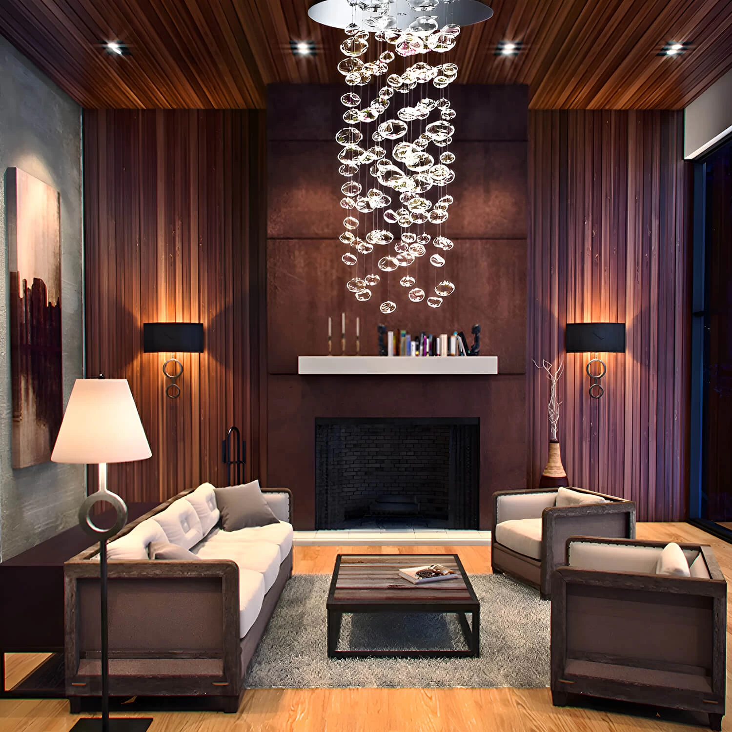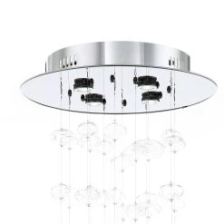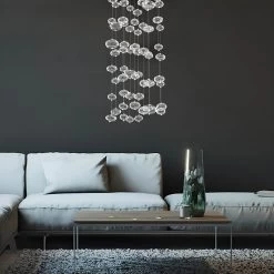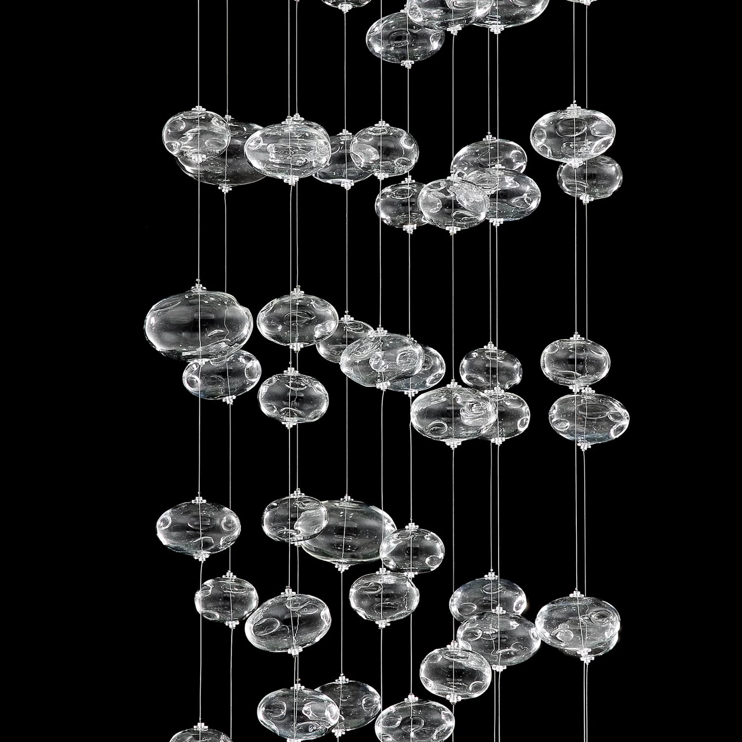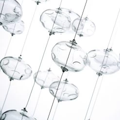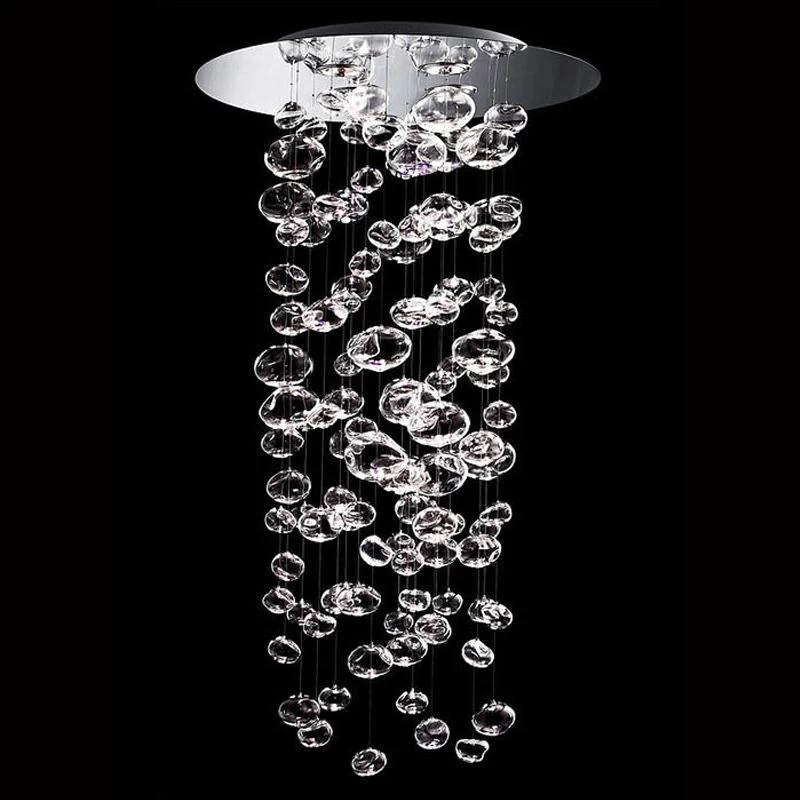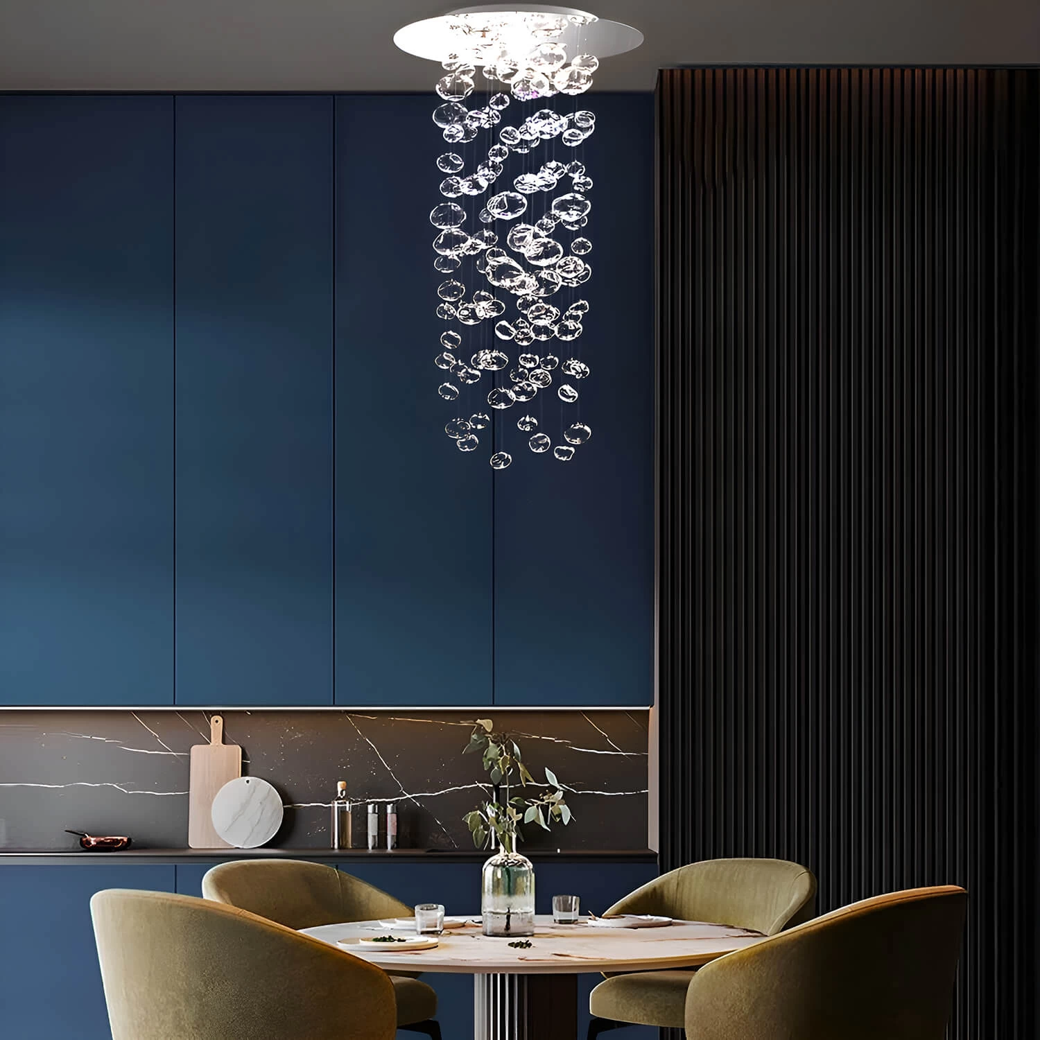 A stunning and alluring piece, this bubble glass chandelier will instantly enhance the modern appeal of your living room or dining area. A cascade of luxurious glass spheres, each uniquely dimpled, are suspended from different heights to create a light and airy impression. The circular canopy on top is made from polished steel, adding to the brilliance for a more dazzling visual effect. This charming modern chandelier will delight for many years to come and also make a great statement piece for foyers, entryways and staircases.Â