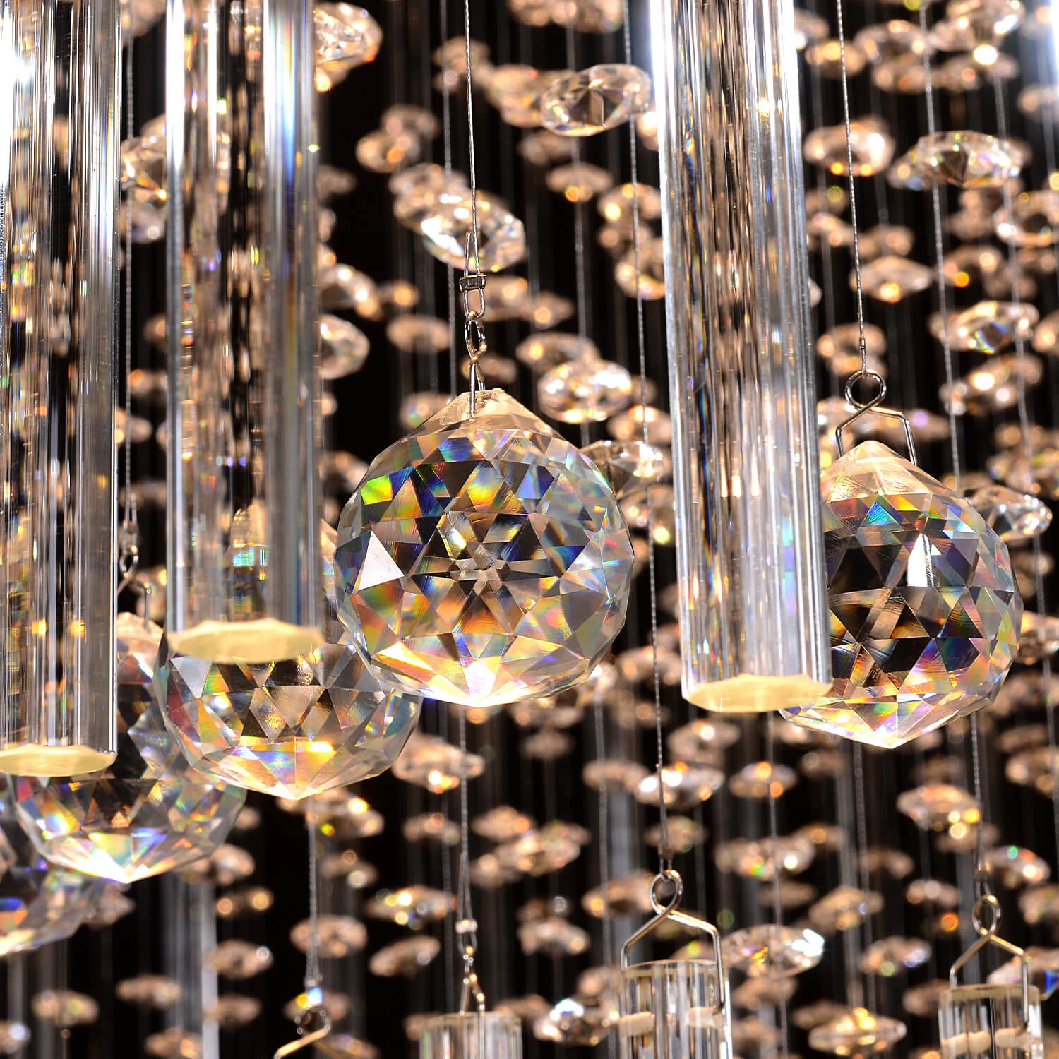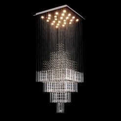 Brilliant in its own sparkling luminescence during the day and doubly so with artificial light sources at night, the Square Floating Castle Raindrop Crystal Chandelier marks the epitome of luxury and sophistication in interior lighting design. A spectacular adornment for modern and contemporary spaces, this stunning chandelier features abundant layers of sparkling beads and crystals for dazzling designer-level lighting. When lit, generous warm light passes through the chorus of glass elements, allowing the crystals to do most of the talking. A perfect choice that is sure to glamorize foyers, entryways, staircases and living rooms with high ceilings.